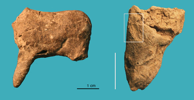 Model of a four-legged animal, possibly a horse or a deer, left, and an artifact with the finger impressions, highlighted in the white box (Rebecca Farbstein / PLoS ONE)