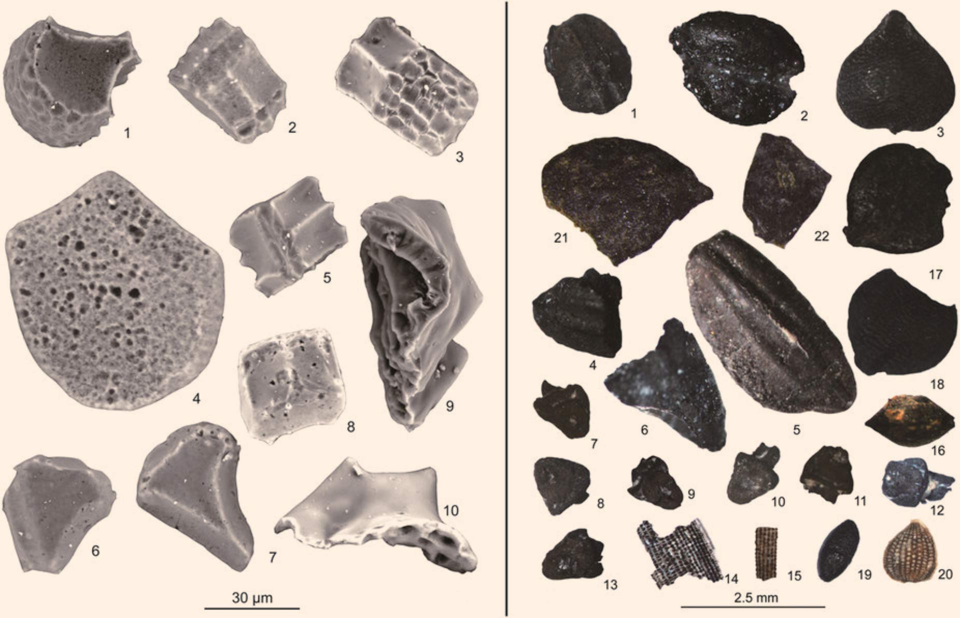 Left: phytoliths from Poaceae bulliform cells and bi-peaked tubercles from rice husks recovered from Huxi: 1, 2, 3 – rice; 4 – reed; 5 – bamboo; 6, 7, 8 – silvergrass; 9, 10 – bi-peaked tubercles of rice. Right: charred plant remains from Huxi: 1 – self-heal; 2 – cupgrass; 3, 17 – sedge family; 4-6 – carbonized rice; 7-13 – rice rachillae; 14-15 – rice husks fragments; 16 – knotweed/smartweed; 18 – bristlegrass; 19 – crabgrass; 20 – tall fringe-rush; 21, 22 – foxnut. Image credit: Y. Zheng et al.