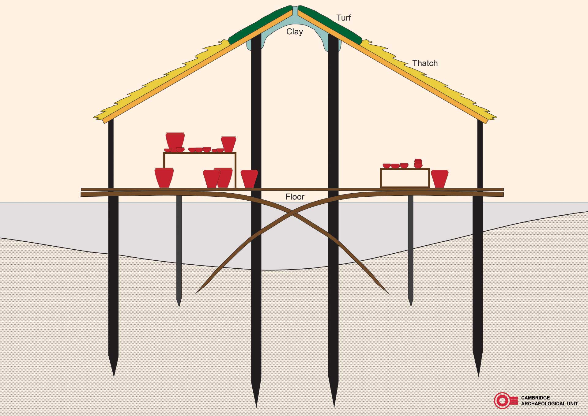 Simplified schematic representation of a typical house at the Must farm settlement. The posts which support the building are very substantial, driven into the sediments at depths of up to 3 m. The roof is made from a combination of thatch and turf with clay around the apex. Image credit: Cambridge Archaeological Unit.
