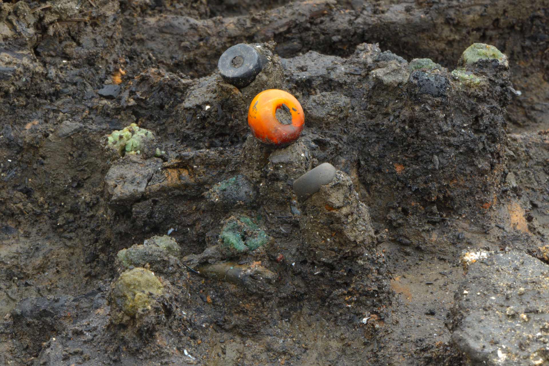 Some 18 pale green and turquoise glass beads have been found which analysis has shown were probably made in the Mediterranean basin or the Middle East.