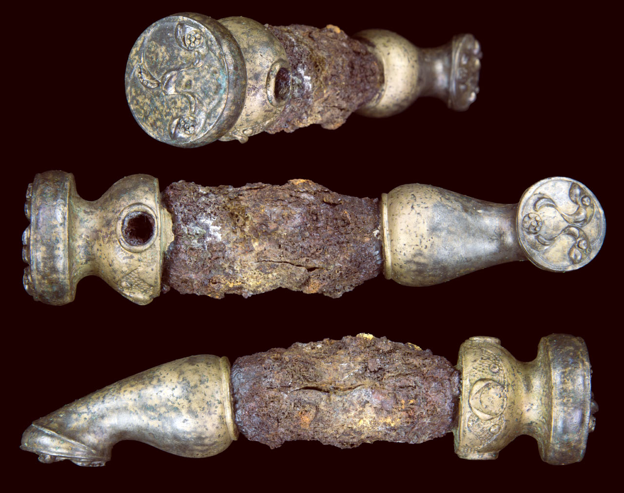 Chariot linch pin from three angles, showing the intricate decoration at the ends. Image credit: University of Leicester.