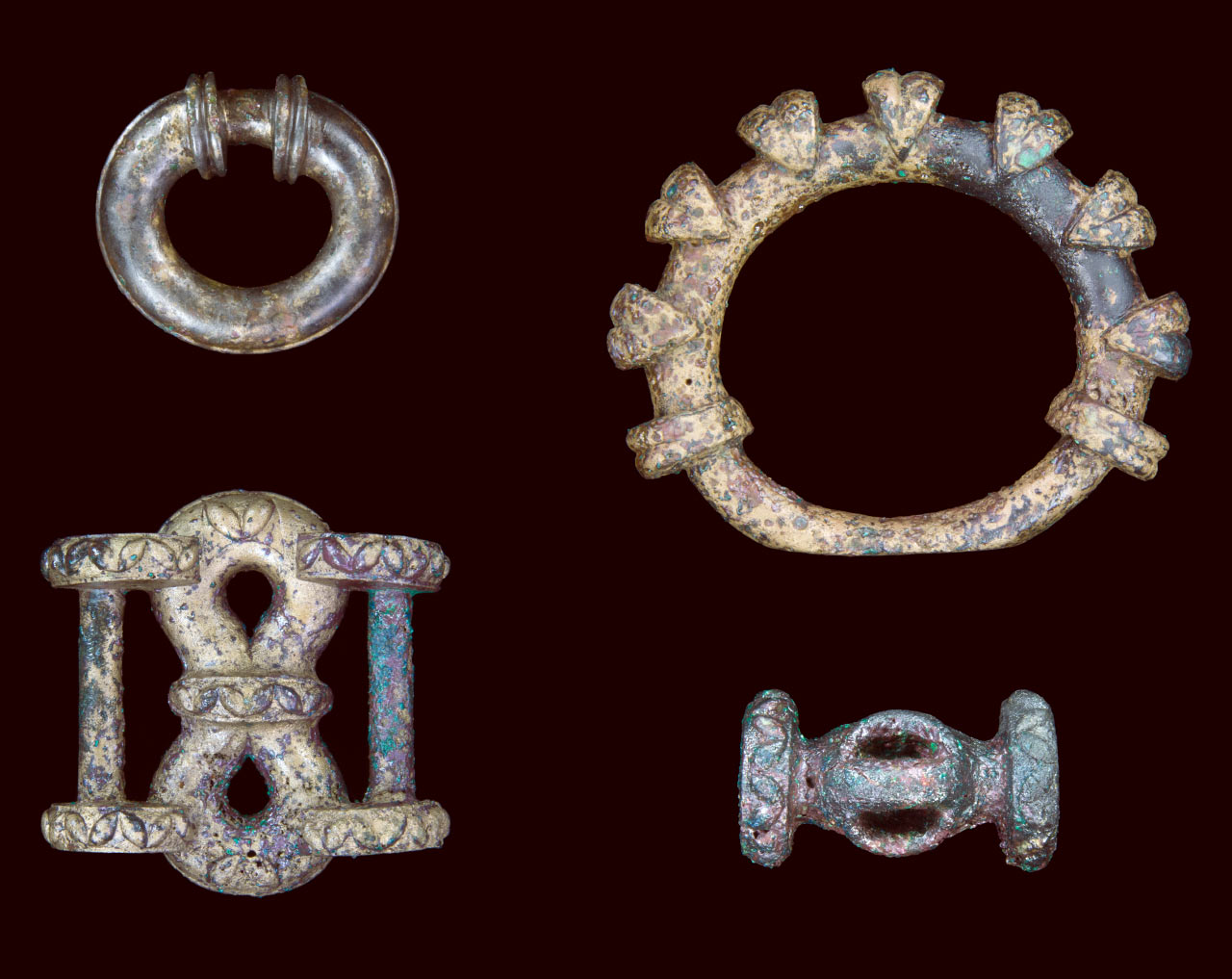 Selection of chariot fittings: miniature terret ring (upper left), large terret ring (upper right), strap junction (lower left) and barrel-shaped harness fitting. Image credit: University of Leicester.