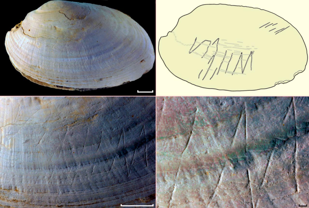 Pseudodon shell with the engraving made by Homo erectus. Image credit: Wim Lustenhouwer / VU University Amsterdam.
