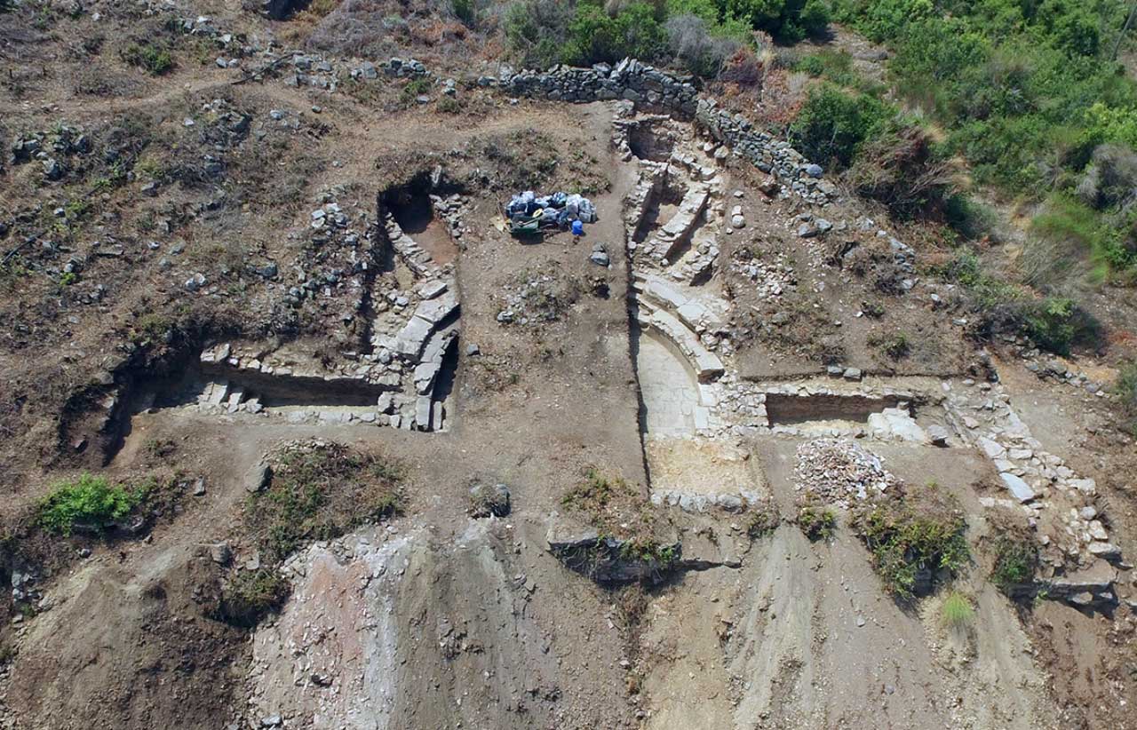 An aerial view of the bouleuterion recently discovered at the site of Antiochia ad Cragum. Test trenches reveal, among other things, a curved marble bench for dignitaries, supports for wooden seats for a general audience and a marble-paved orchestra area. Image credit: Michael Hoff / University of Nebraska-Lincoln.