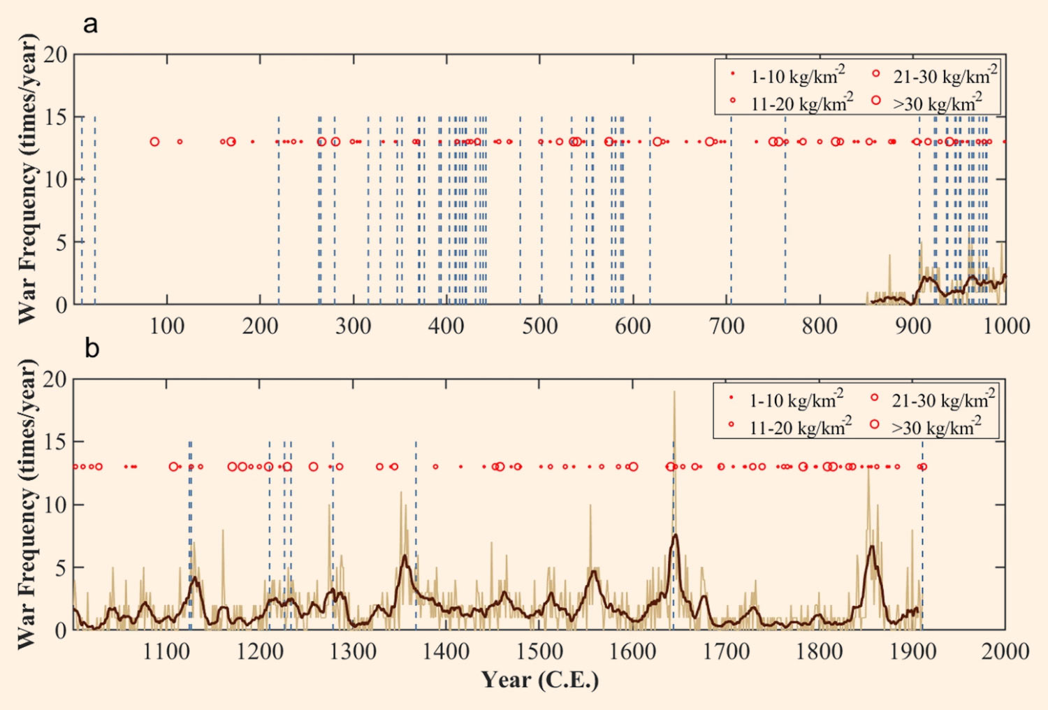 Chinese dynastic collapse, explosive volcanism, and warfare frequency, 1-1911 CE: consensus dates for 68 dynastic collapses (blue dashed vertical columns), overlain by ice-core-based dates and climate forcing potential of inferred-tropical and extratropical northern hemispheric explosive volcanic eruptions (n=156) as inferred by multi-ice-core measurements of polar sulfate deposition (graduated red circles), for 1-1911 CE. Also shown is annual warfare frequency from 850 to 1911 CE (continuous tan line), with the thick brown line representing a 10-year smoothing using the Savitzky-Golay filter. The figure is split into two consecutive periods for visual clarity; a and b cover the first and second millennia CE, respectively. Image credit: Gao et al., doi: 10.1038/s43247-021-00284-7.