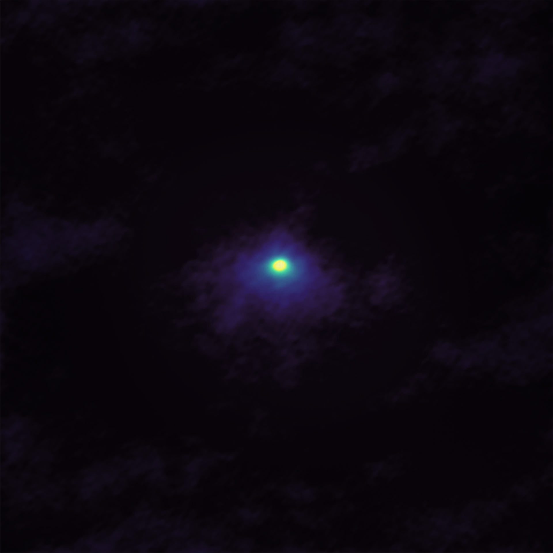 ALMA image of 46P/Wirtanen taken on December 2, 2018, as the comet approached Earth. The image shows the concentration and distribution of HCN molecules near the center of the comet’s coma. Image credit: ALMA / ESO / NAOJ / NRAO / M. Cordiner / NASA / CUA.