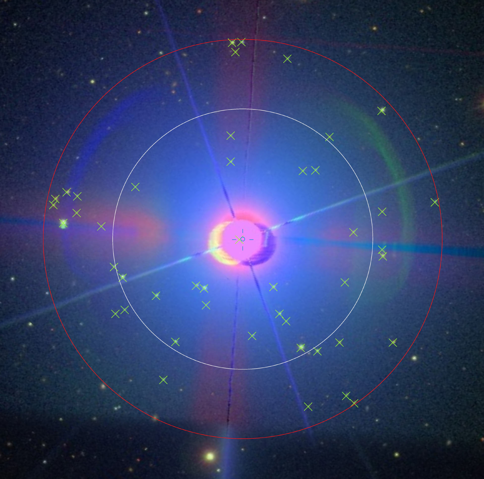 An optical color image of the stellar field centered on HIP 109427, an A1-type star located 89 light-years away in the constellation of Pegasus, from the Pan-STARRS survey, showing the target fields of Green Bank and Parkes receivers, circled in red and white respectively; 46 sources with geometric distances calculated from Gaia data are marked with green crosses. Image credit: Wlodarczyk-Sroka et al, arXiv: 2006.09756.