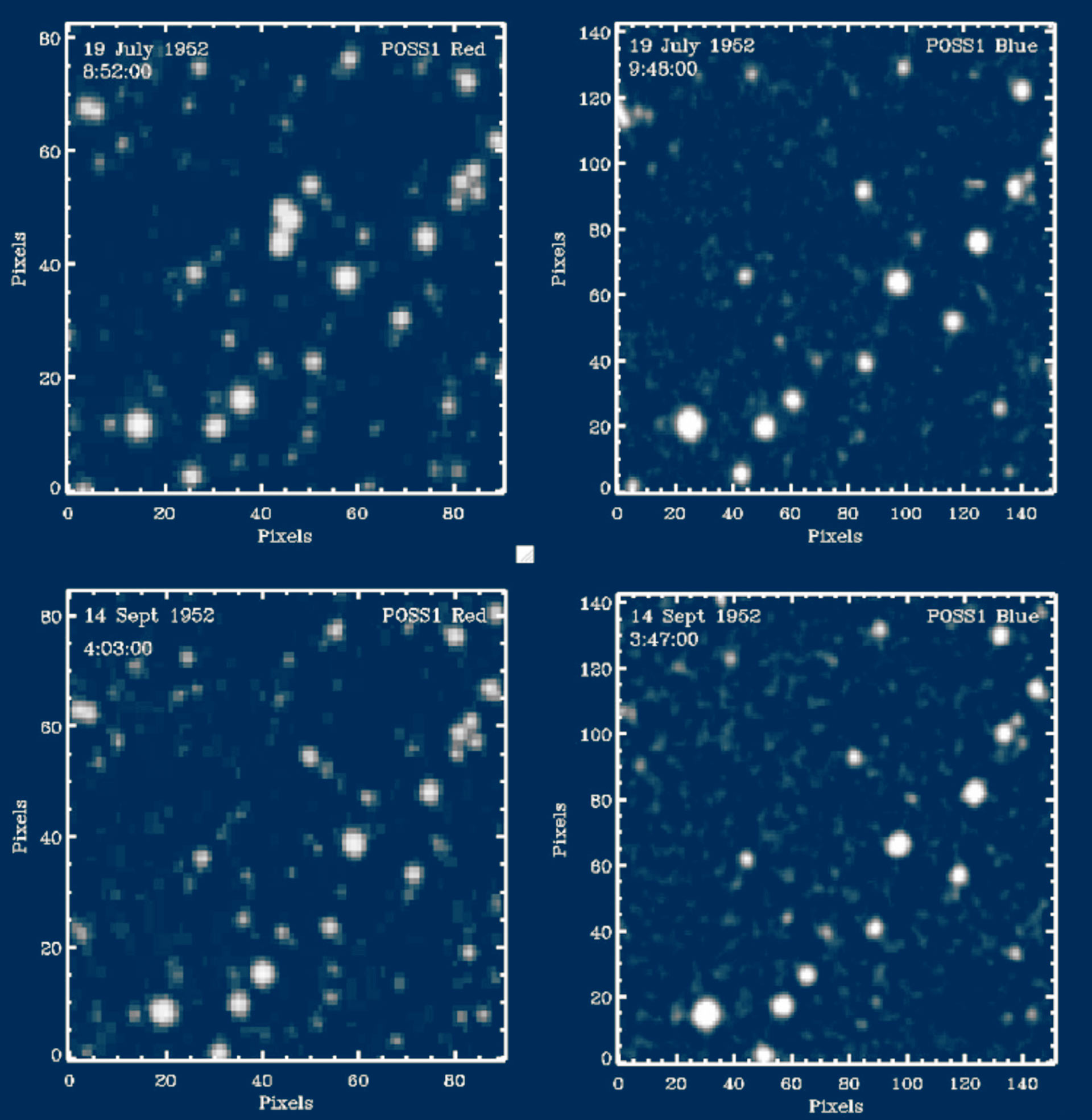 Four exposures of the 3 x 3 arcmin region of sky centered on the triple transient identified in July 1952. Upper left: the POSS I red image on July 19, 1952 at 8:52 (UT) containing the triple transient just above center. Upper right: a 10 m exposure POSS I blue image of the same region taken immediately afterward with no evidence of the triple transient. Lower left and right: POSS I red (left) and blue (right) images taken two months later (September 14, 1952) showing the transient still gone. Image credit: Solano et al., doi: 10.1093/mnras/stad3422.