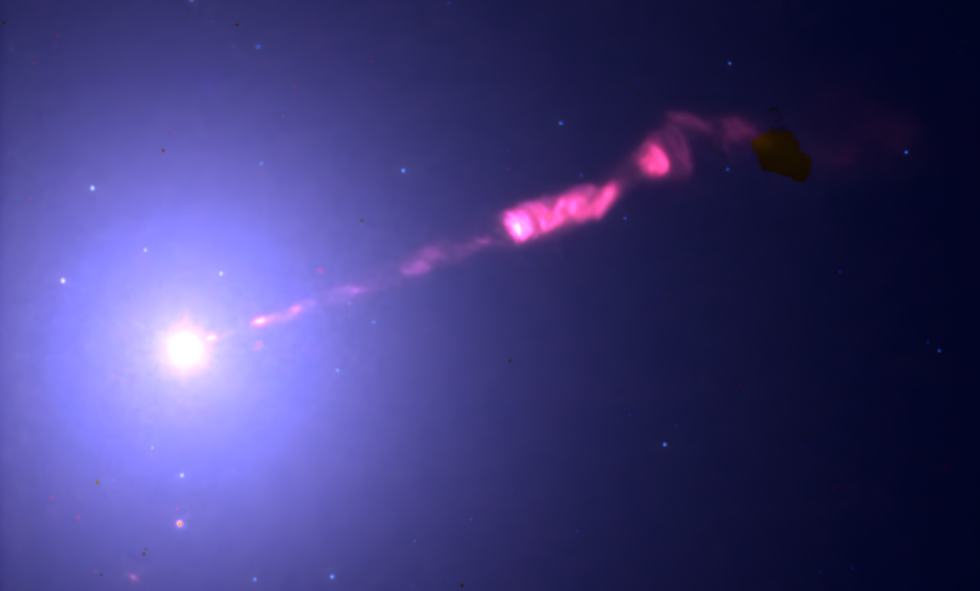 This black hole powers a bright, narrow jet of particles that blasts out of the galaxy’s core and stretches for about 3,000 light-years into space.
