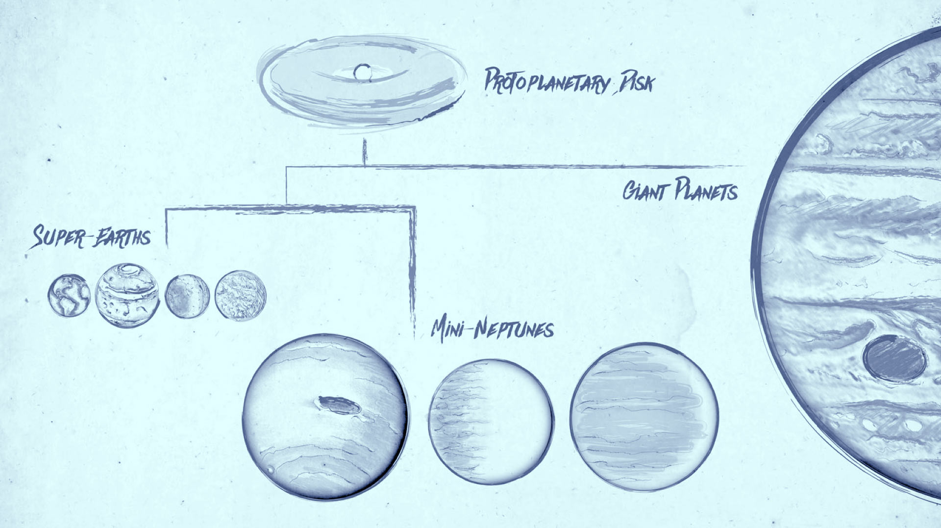 This sketch illustrates a family tree of exoplanets. Planets are born out of swirling disks of gas and dust called protoplanetary disks. The disks give rise to giant planets like Jupiter as well as smaller planets mostly between the size of Earth and Neptune. Image credit: NASA / Ames Research Center / JPL-Caltech / Tim Pyle.