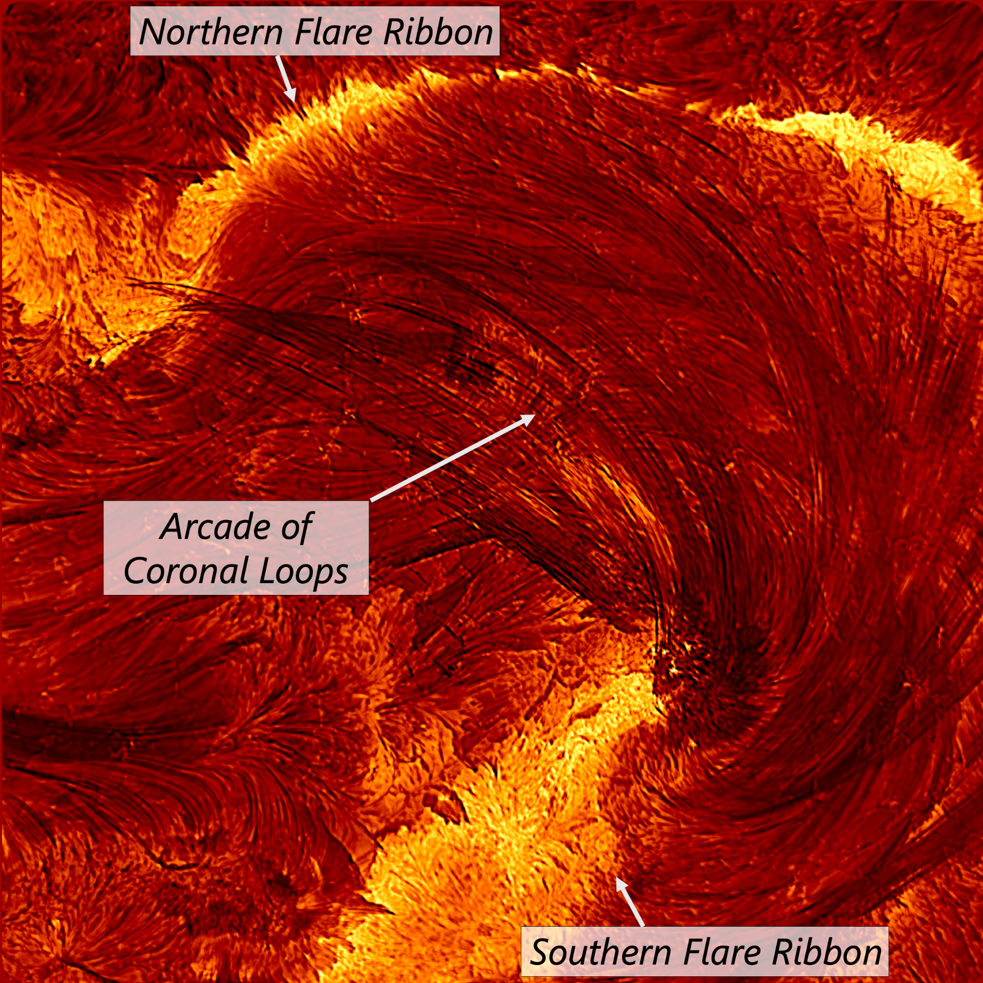 A high-resolution image of the flare from the Inouye Solar Telescope, taken on August 8, 2024, at 20:12 UT. The image is about 4 Earth-diameters on each side. Labels of the different relevant regions of the image are added for clarity: flare ribbons (bright areas of energy release in the dense lower solar atmosphere) and an arcade of coronal loops (arcs of plasma outlining magnetic field lines that transport energy from the corona to the flare ribbons). Image credit: NSF / NSO / AURA.