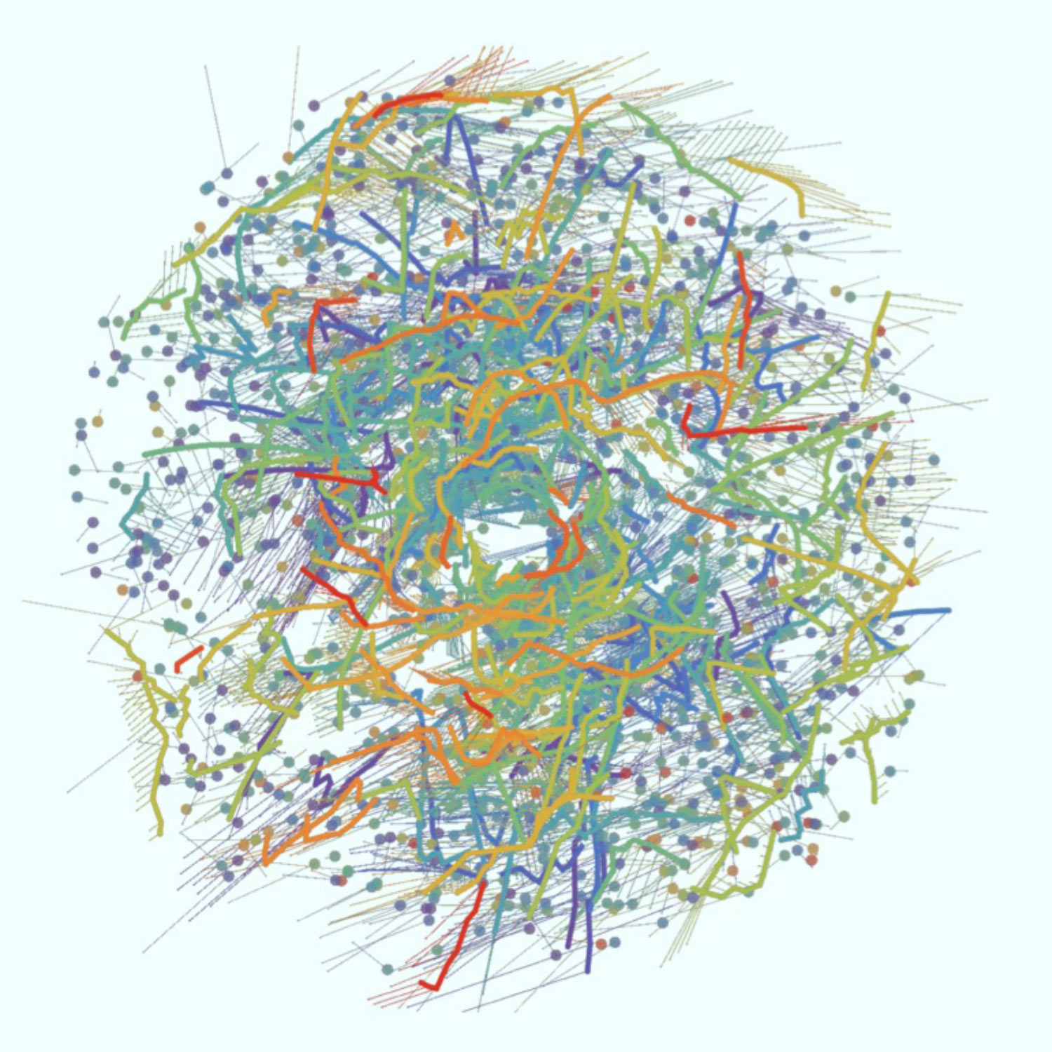 This diagram shows a face-on view of stellar ‘families’ — clusters (dots) and co-moving groups (thick lines) of stars — within about 3,300 light-years from the Sun, which is located at the center of the image. Each family is identified with a different color and comprises a population of stars that formed at the same time. Purple hues represent the oldest stellar populations, which formed around 1 billion years ago; blue and green hues represent intermediate ages, with stars that formed hundreds of millions of years ago; orange and red hues show the youngest stellar populations, which formed less than a hundred million years ago/ Thin lines show the predicted velocities of each group of stars over the next 5 million years, based on Gaia’s measurements. The lack of structures at the center is an artifact of the method used to trace individual populations, not due to a physical bubble. Image credit: M. Kounkel & K. Covey.