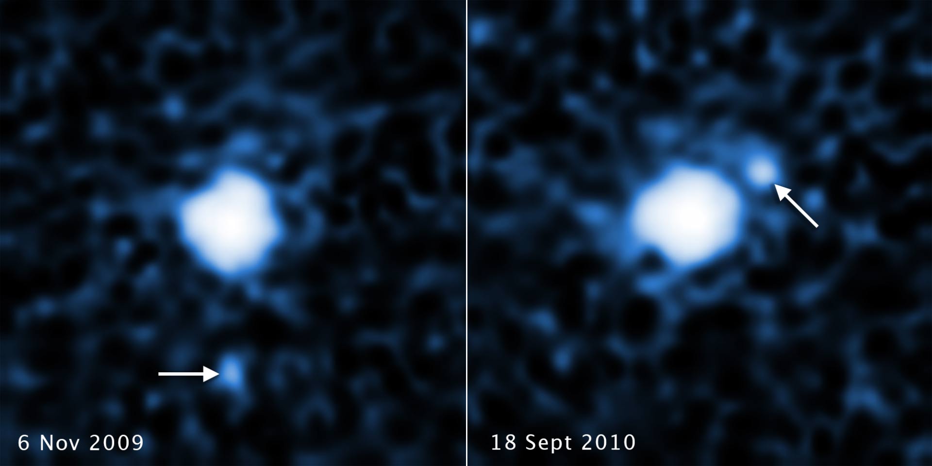 These two images, taken in 2009 and 2010, reveal a moon orbiting the dwarf planet 2007 OR10. Each image, taken by Hubble’s Wide Field Camera 3, shows the companion in a different orbital position around its parent body. Image credit: NASA / ESA / C. Kiss, Konkoly Observatory / J. Stansberry, STScI.