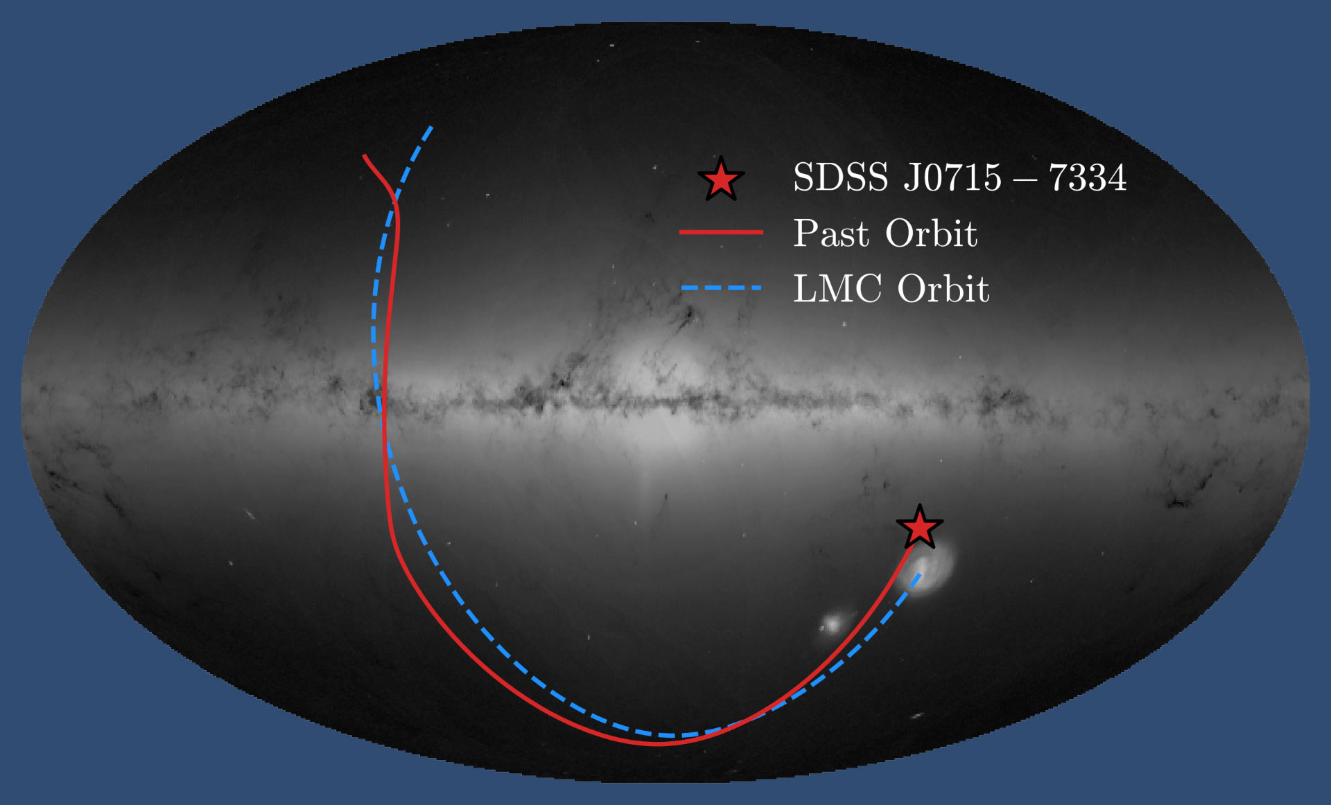 The Milky Way Galaxy with the position of SDSS J0715-7334 marked with a star symbol; the solid red line shows the path the star has taken through our Galaxy; the dashed blue line shows the path expected for a star born in the Large Magellanic Cloud. Image credit: Vedant Chandra / SDSS Collaboration / ESA / Gaia / A. Moitinho, A. F. Silva, M. Barros, C. Barata, University of Lisbon / H. Savietto, Fork Research.