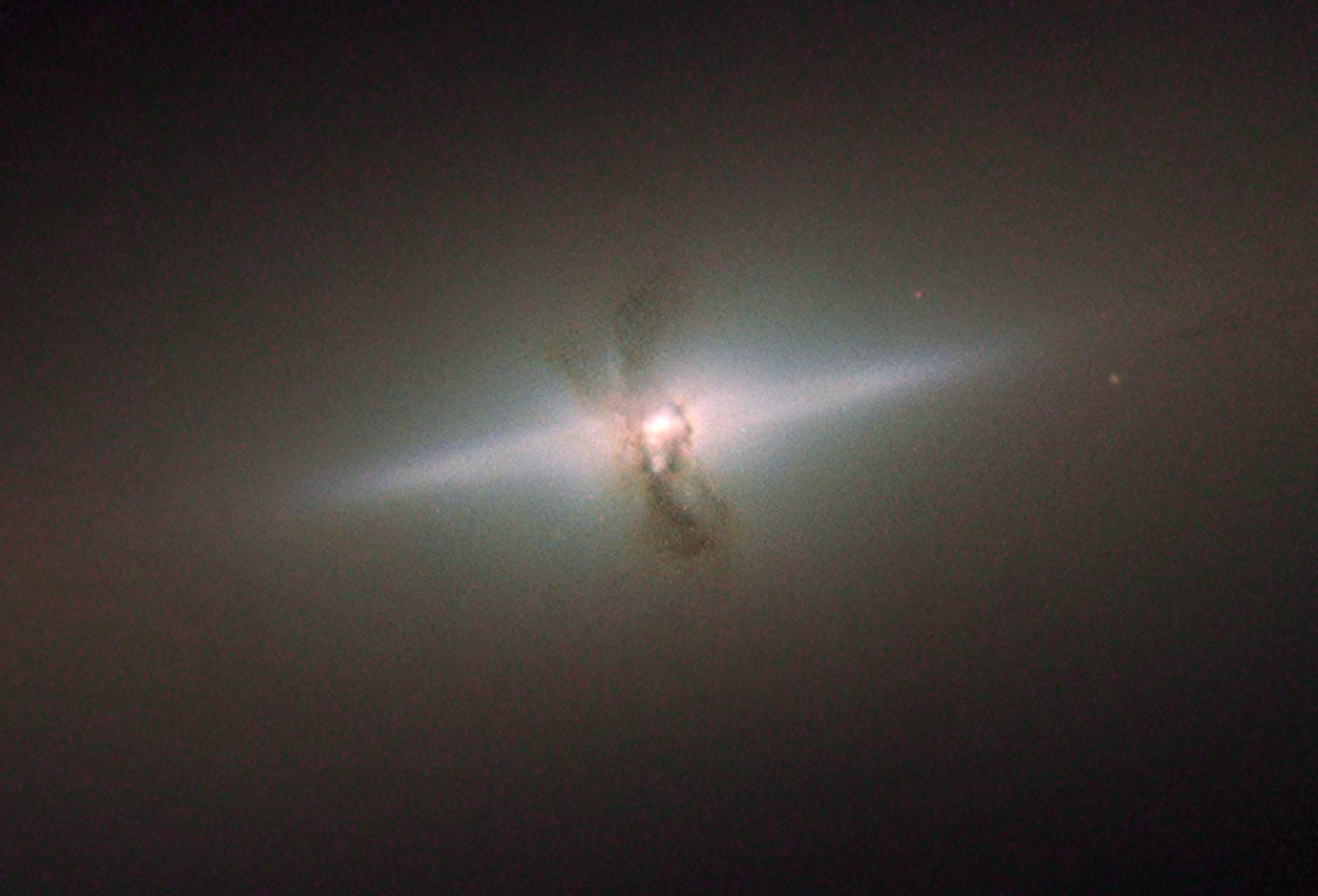 Running through its centre, at right angles to the thin disc, is a series of filaments, silhouetted against the bright core of the galaxy.