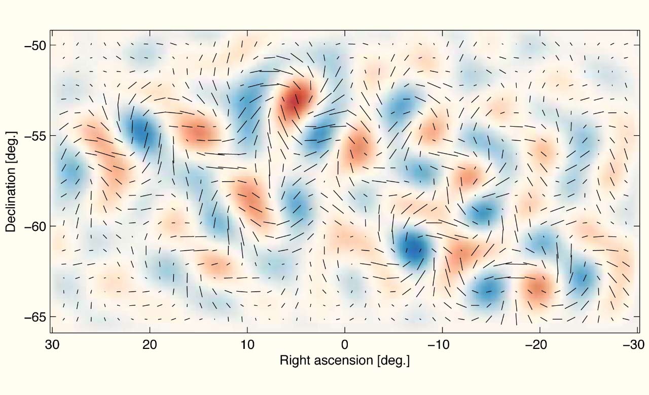 Gravitational waves from inflation generate a faint but distinctive twisting pattern in the polarization of the cosmic microwave background, known as B-mode pattern. For the density fluctuations that generate most of the polarization of the CMB, this part of the primordial pattern is exactly zero. Shown here is the actual B-mode pattern observed with the BICEP2 telescope, which is consistent with the pattern predicted for primordial gravitational waves. The line segments show the polarization strength and orientation at different spots on the sky. The red and blue shading shows the degree of clockwise and anti-clockwise twisting of this B-mode pattern. Image credit: BICEP2 Collaboration.