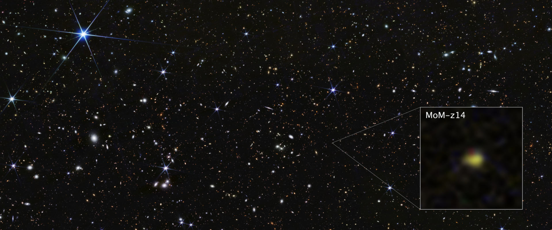 MoM-z14 is one of a growing group of surprisingly bright galaxies in the early Universe — 100 times more than theoretical studies predicted before the launch of Webb.