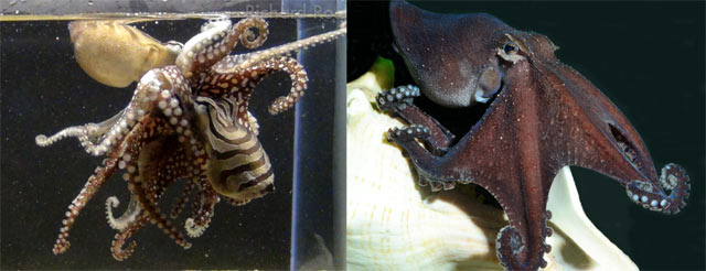 Left: Larger Pacific Octopuses mate dangerously ‘beak to beak’ (Richard Ross) Right: Larger Pacific Striped Octopus presenting a dark ‘leaf’ display (Roy Caldwell)