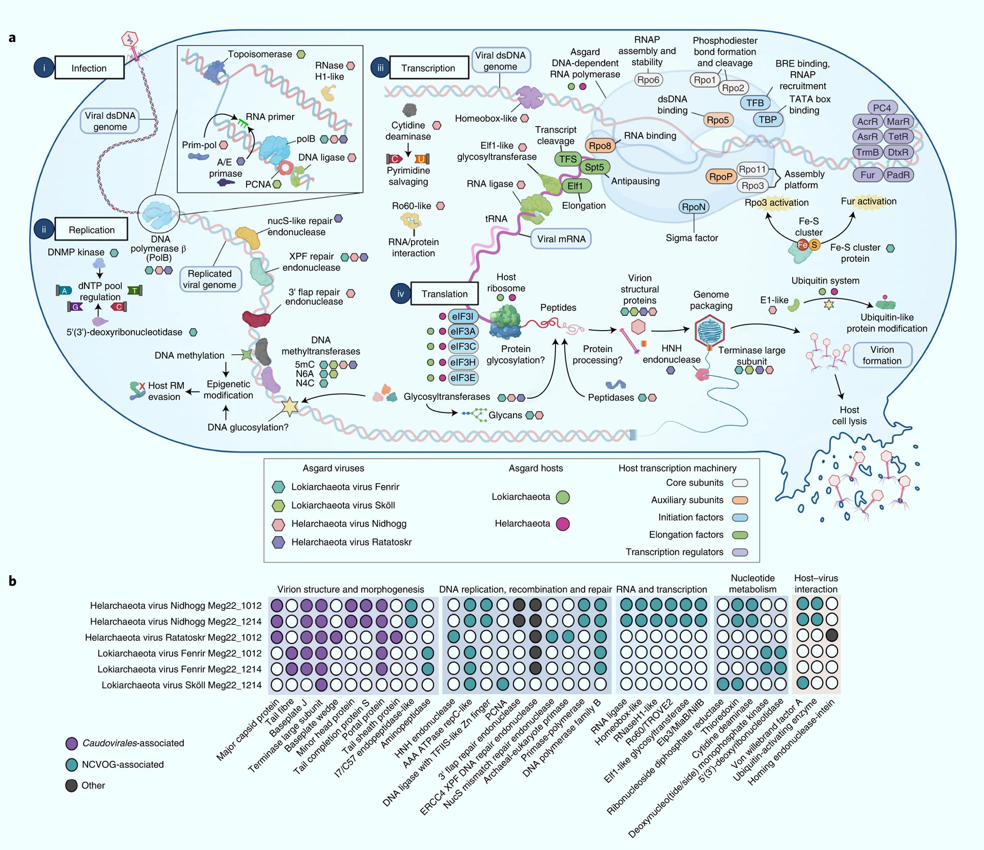 Model of Asgard viral infection mechanisms and protein similarity with other viruses: (a) genes identified in Asgard viruses involved in infection (i), replication (ii), transcription (iii) and translation (iv); Asgard viruses are shown as different colored hexagons, Asgard hosts as different colored circles, and host transcription machinery is labeled with ovals color coded by function (see legend); (b) distribution of 35 genes (lower x axis) among Asgard viruses (y axis); filled circles indicate annotated orthologues, while white circles indicate that an orthologue was not identified. Image credit: Rambo et al., doi: 10.1038/s41564-022-01150-8.