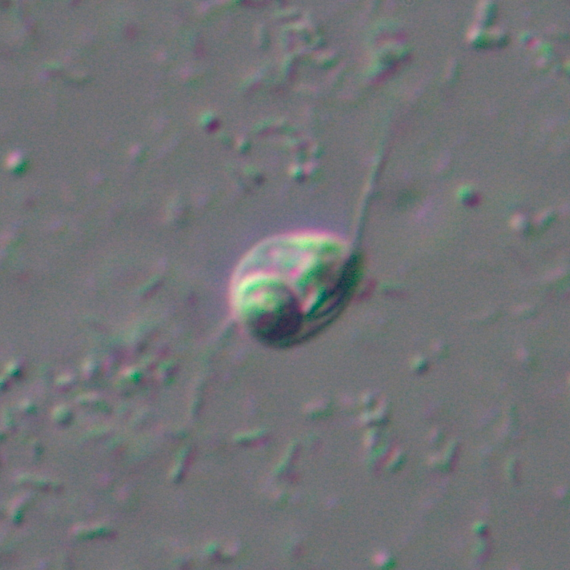 Ancoracysta twista: differential interference contrast microscopy of a cell; two flagella, the feeding gullet, nucleus and a posterior digestive vacuole are visible. Image credit: Denis V. Tiknonenkov.