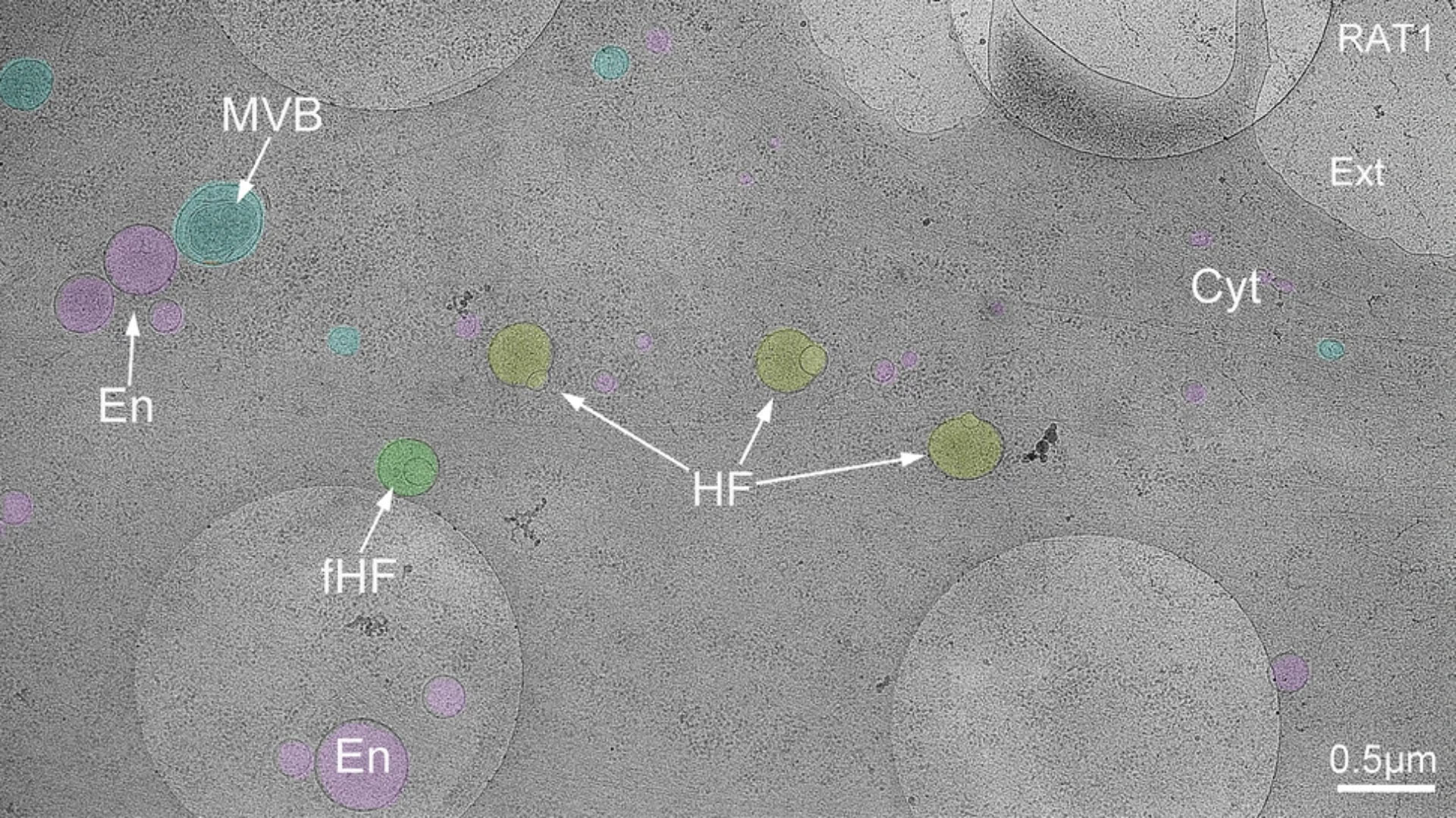 Representative cryo-electron microscopy image of the leading edge of a RAT-1 cell cultured on cryo-EM grids. Lamellipodia and filopodia in the upper right corner delineate the cell border, separating the cytoplasm (Cyt) from the extracellular space (Ext). Vesicular organelles are highlighted in color: early endosome-like vesicles (En, pink), multivesicular bodies (MVB, blue), hemifusomes (HF, yellow), and flipped hemifusomes (fHF, green). Scale bar – 0.5 µm. Image credit: Tavakoli et al., doi: 10.1038/s41467-025-59887-9.