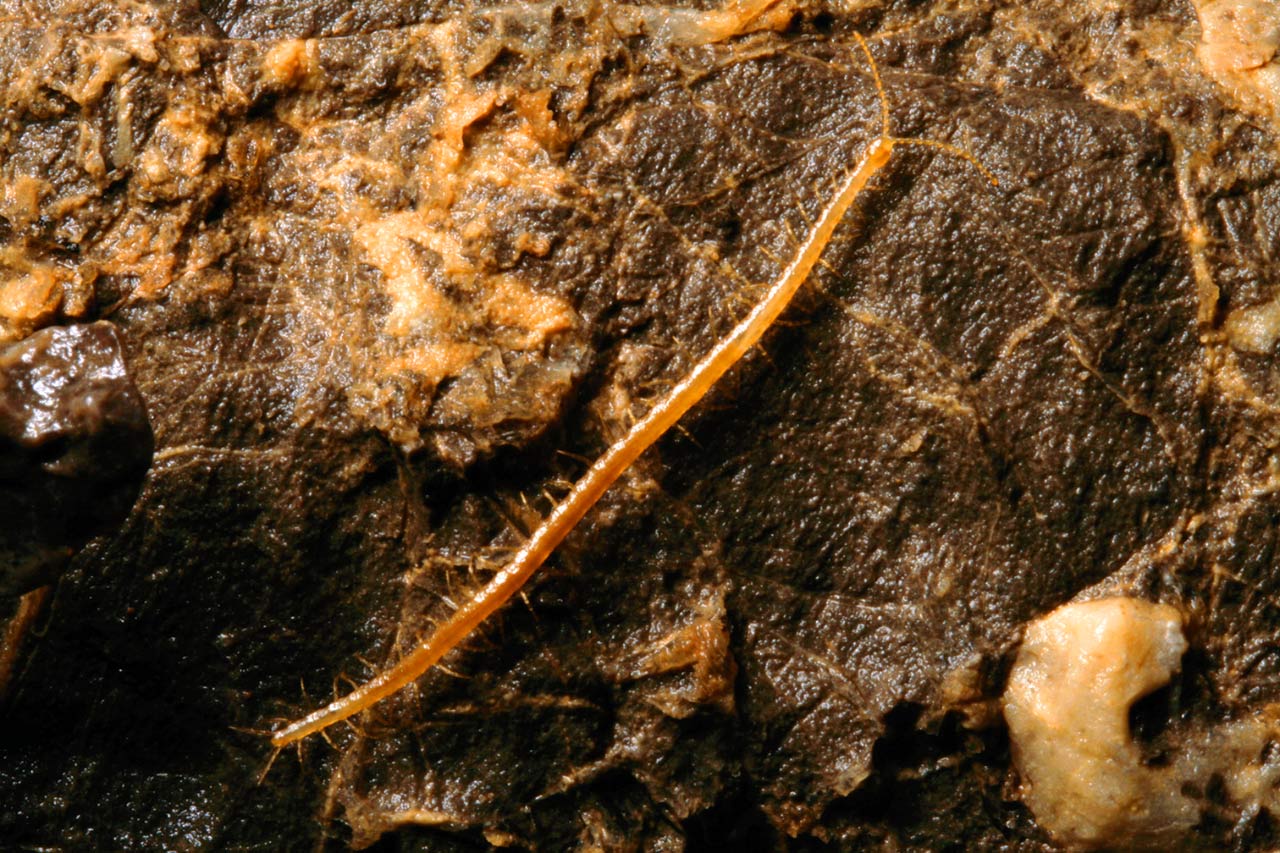 Geophilus hadesi, male specimen in the Lukina jama – Trojama cave system, at -980 m below the surface. Image credit: J. Bedek.