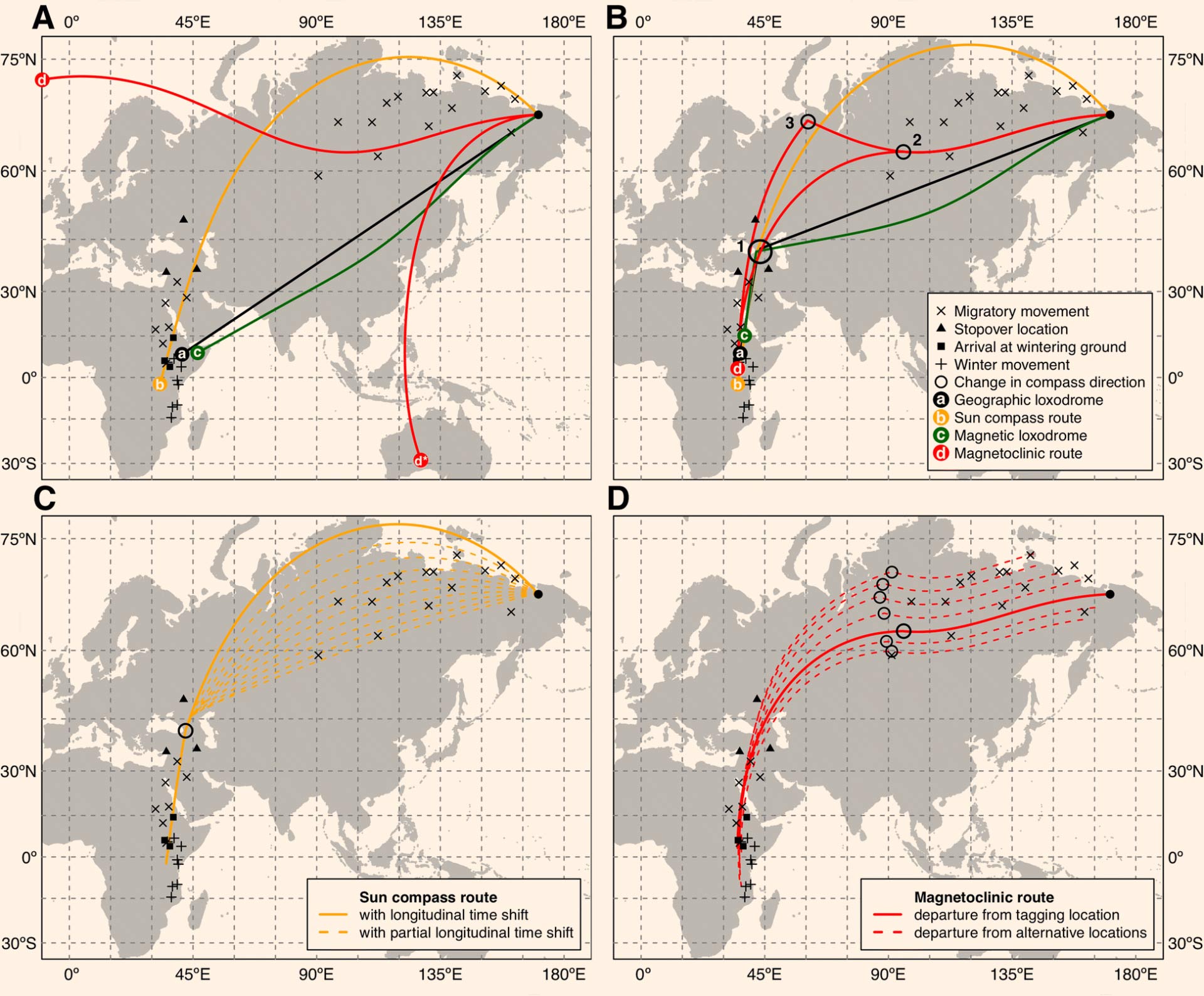 Simulated autumn migration routes of willow warblers using alternative compass mechanisms and aiming to the wintering ground (first winter stop) through: (a) direct route or (b) an intermediate goal area (stopover region). In panel (A) only the Sun compass route (b) crosses the identified stopover region (filled black triangles) and neither of the two possible solutions for the magnetoclinic route (d and d*) could reach the wintering area. In panel (B) all routes have a solution that brings birds to the stopover region before switching the compass direction toward the wintering ground (black circle 1). However, for the magnetoclinic route the switch must occur earlier and at higher latitudes (between black circle 2 and 3) than for the other compass mechanisms (black circle 1). (c) a sun compass can produce alternative routes when the bird’s internal clock partially adapts to the local time (i.e. partial longitudinal time-shift), but an intermediate goal area would still be necessary to cross the stopover region. (d) alternative magnetoclinic routes can be generated from locations with alternative geomagnetic inclination values (i.e. different starting points) for which a change in compass on route must always occur not earlier than 85-95 degrees E longitude. For all the panels, departure location (filled black circle) is the breeding area where birds where tagged. GLS data for the three birds tracked in this study are also reported. Image credit: Sokolovskis et al, doi: 10.1186/s40462-018-0138-0.