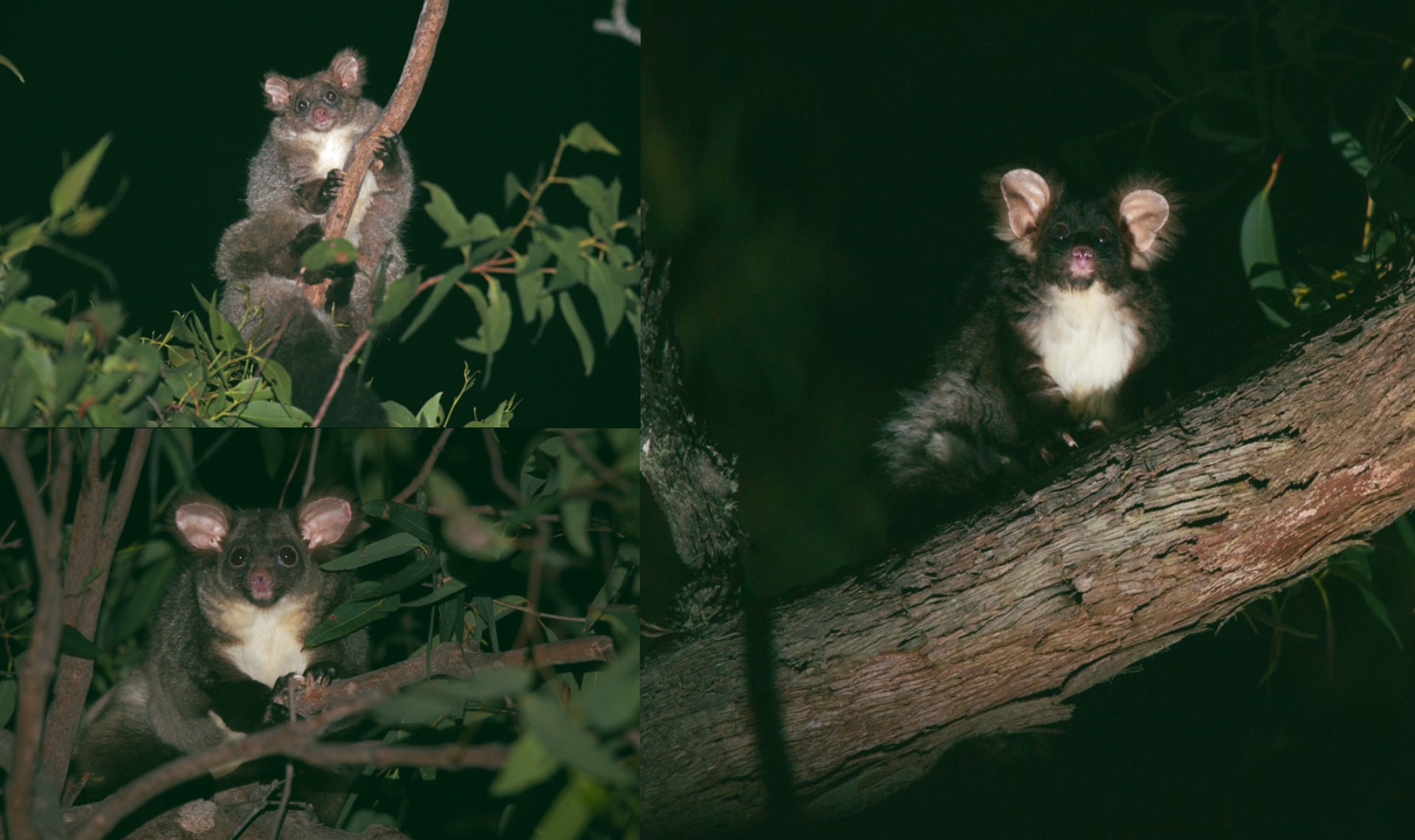 Petauroides minor (top left), Petauroides armillatus (bottom left) and Petauroides volans (right) greater gliders. Image credit: Denise McGregor / Jasmine Vink.
