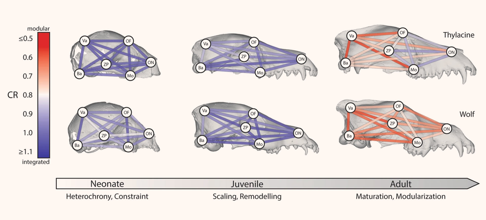 Network diagrams of module covariation patterns during ontogeny: pairwise covariance ratio (CR) coefficients between cranial landmark modules for the thylacine and the gray wolf on neonate, juvenile, and adult 3D rendered skulls; low CR values are expressed by warm colors, indicating modularity, whereas cool colors represent high CR values, suggesting integration; neonatal and juvenile modules show high CR ratios (integration); the adult thylacine retains an integrated facial skeleton, while the adult wolf skull becomes modular. Abbreviations: Ba – basicranium, Mo – molar, OF – orbitofrontal, ON – oral-nasal, Va – vault, ZP – zygomatic-pterygoid. Image credit: Newton et al., doi: 10.1038/s42003-020-01569-x.