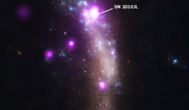 Using NASA’s Chandra X-ray Observatory, astronomers have discovered the first X-ray evidence of a supernova shock wave breaking through a cocoon of gas surrounding the star that exploded. This composite image of UGC 5189A shows X-ray data from Chandra in purple and optical data from Hubble Space Telescope in red, green and blue. SN 2010jl is the very bright X-ray source near the top of the galaxy (X-ray image: NASA / CXC / Royal Military College...