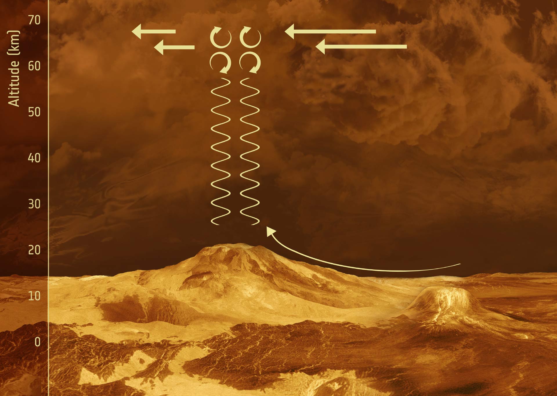 Schematic illustration of the proposed behavior of gravity waves in the vicinity of mountainous terrain on Venus. Winds pushing their way slowly across the mountainous slopes on the surface generate gravity waves – an atmospheric phenomenon also often seen in mountainous parts of Earth’s surface. These waves form when air ripples over bumpy surfaces. The waves then propagate vertically upwards, growing larger and larger in amplitude until they break just below the cloud-top, like sea waves on a shoreline. As the waves break, they push back against the fast-moving high-altitude winds and slow them down. The background is an artist’s impression of the Venusian surface beneath the cloud tops. Image credit: ESA.