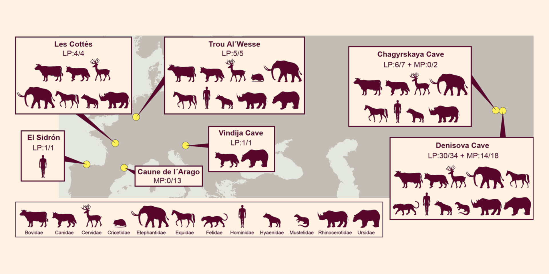 Ancient species detected in Late Pleistocene (LP) and Middle Pleistocene (MP) samples from seven sites: for each time period, the fraction of samples containing DNA fragments which could be assigned to a mammalian family and authenticated to be of ancient origin is indicated; the shaded symbols representing each family are not to scale. Image credit: Slon et al, doi: 10.1126/science.aam9695.