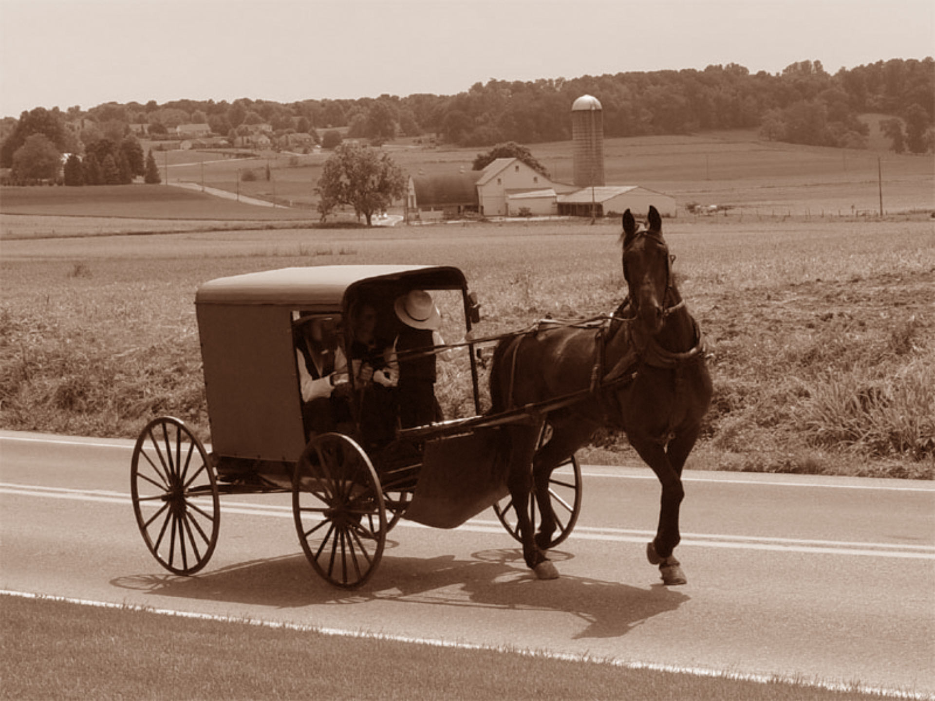 Amish family riding in a traditional Amish buggy in Lancaster County, Pennsylvania. Image credit: Utente.