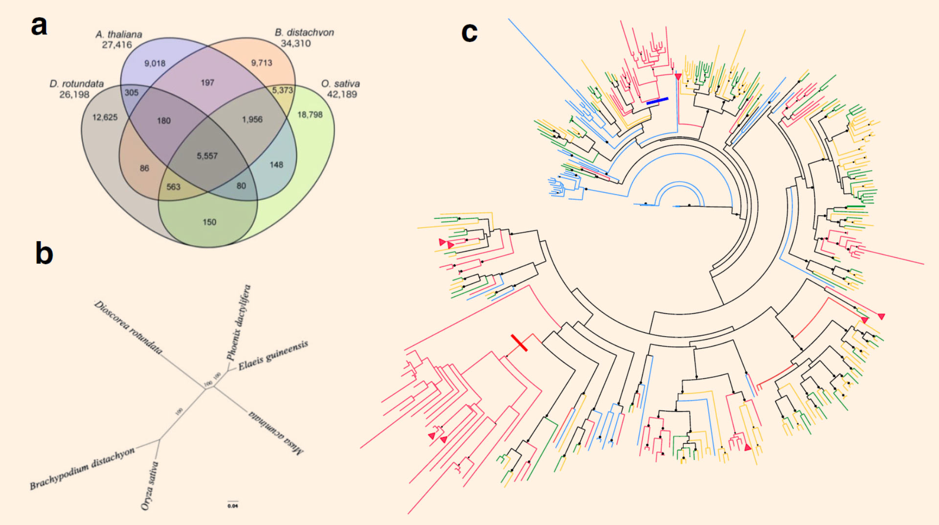 Comparative genomics of the white Guinea yam (Dioscorea rotundata) and other angiosperm species: (a) Venn diagram showing conserved and unique genes at 1:1 correspondence among the white Guinea yam, Arabidopsis thaliana, Brachypodium distachyon, and Oryza sativa; total gene counts in each genome are given below the species name; (b) maximum likelihood tree of the white Guinea yam, B. distachyon, O. sativa, Elaeis guineensis, Musa acuminata, and Phoenix dactylifera based on 2,381 orthologous protein-coding genes; the bootstrap values across 1,000 resamplings are shown; the scale bar represents the mean number of substitutions per site; (c) phylogenetic analysis of the relationships of mannose-specific bulb-type lectin proteins in the white Guinea yam (red), A. thaliana (blue), B. distachyon (green), and O. sativa (orange); arrowheads represent bulb-type lectins observed to have enriched expression in tubers; high confidence bootstrap values (1,000 replicates) are represented at the nodes of the tree as dots; thick red and blue lines show two root branches of white Guinea yam -specific expanded genes. Image credit: Tamiru et al, doi: 10.1186/s12915-017-0419-x.