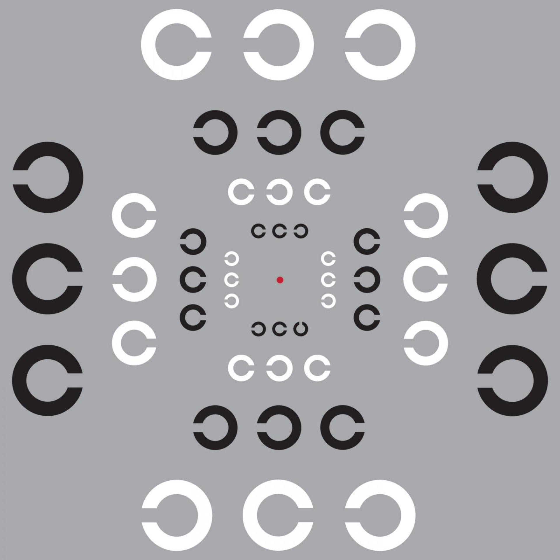 This is an image to demonstrate visual ‘crowding’ and test peripheral vision. Ensure that the red dot in the center of the image is at eye level and focus on it. While holding your focus on the red dot, try to read the middle ‘C’ in every triplet. Is the gap facing left or right? You may find it easier to read in some directions than others. People usually find it easier to read below the dot than above, and easier still to the left or right. Image credit: John Greenwood, University College London.