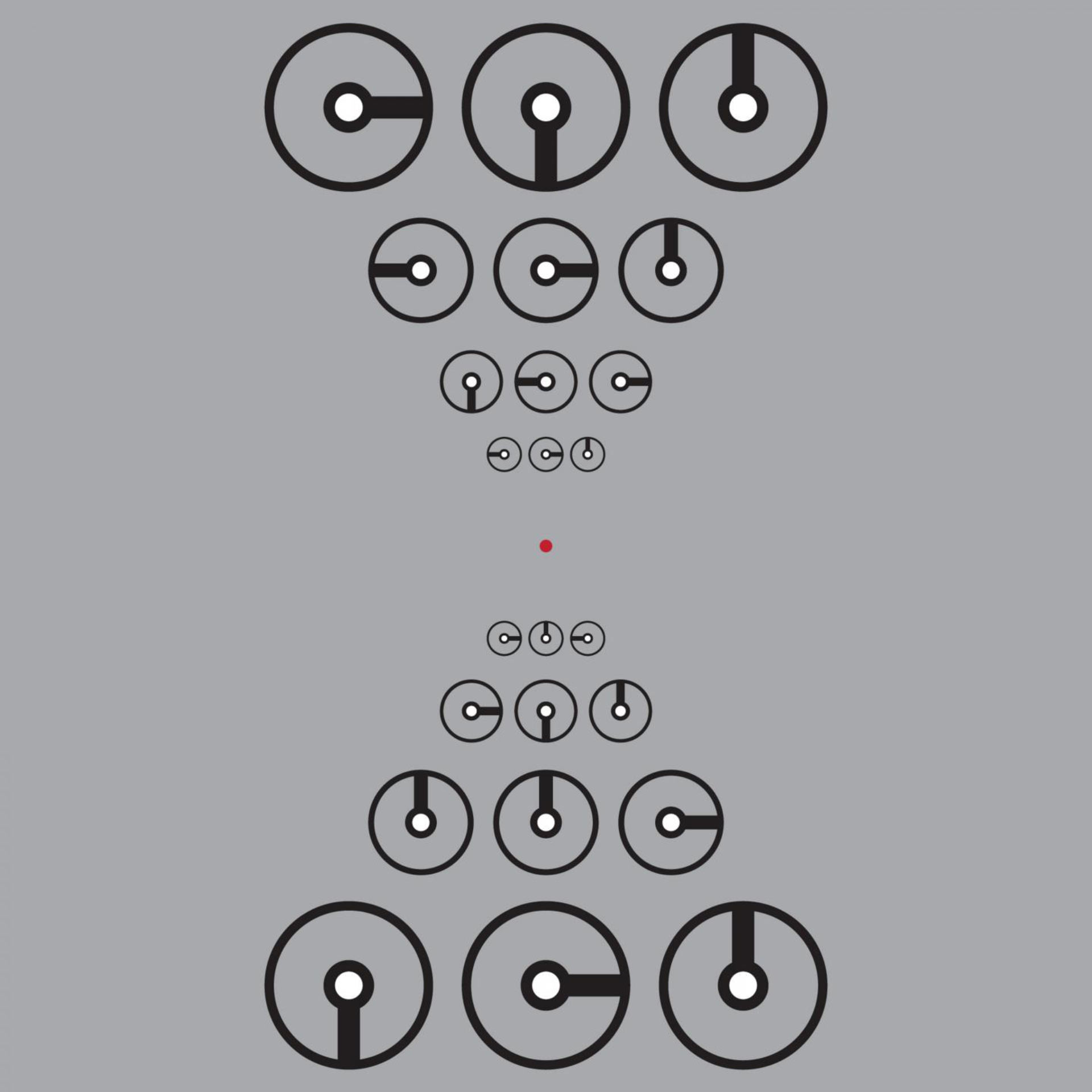 This is an image to demonstrate visual ‘crowding’ and test peripheral vision. Ensure that the red dot in the center of the image is at eye level and focus on it. While holding your focus on the red dot, try to read the time on the middle clocks to the left and right. You may find that your peripheral vision is better on one side than the other. Image credit: John Greenwood, University College London.