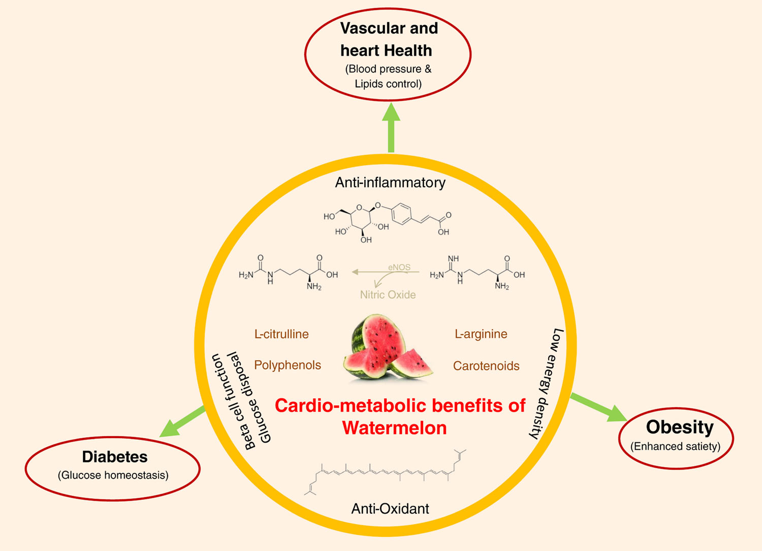 “Central to these effects may be the provision of citrulline/arginine; however, when combined with several other notable components such as (poly)phenols, lycopene, potassium, and magnesium, effects of watermelon intake on cardio-metabolic endpoints may be expected.”