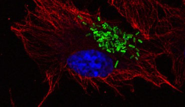British scientists have identified a way in which Salmonella, the bacteria that cause typhoid fever and gastroenteritis, inactivate immune defenses in human cells. This image shows Salmonella bacteria, green, invading a human red blood cell (Kieran McGourty et al / Imperial College London) One way in which human cells fight off infections is by engulfing the smaller bacterial cells and then attacking them with toxic enzymes contained in small packets...