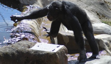 A team of researchers from Lund University in Sweden studying the behavior of Santino the chimpanzee at Furuvik Zoo in Stockholm has found that he uses innovative foresighted methods to fool zoo visitors. Image shows Santino the chimpanzee when he slowly moved towards the group of visitors and picked up an apple from the water moat 15 seconds before releasing his projectiles, note two projectiles in his left hand (Tomas Persson) Chimpanzee Santino...