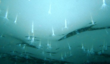 Researchers from the Antarctic Geological Drilling (ANDRILL) Program have described a new species of anemone from waters beneath the Ross Ice Shelf, Antarctica. In an underwater image, Edwardsiella andrillae anemones protrude from the bottom surface of the Ross Ice Shelf. They glow in the camera’s light. Image credit: Frank Rack / ANDRILL Science Management Office, University of Nebraska-Lincoln. The newly discovered species, named Edwardsiella...