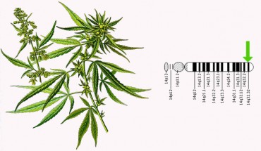 A genetic study led by Dr Marta Di Forti from the King’s College London’s Institute of Psychiatry has provided new evidence that genetic variation in the AKT1 gene – short for ‘V-akt murine thymoma viral oncogene homolog 1’ – influences the risk of developing psychosis in cannabis users. Left: this drawing from Franz Eugen Köhler’s Medizinal-Pflantzen shows Cannabis sativa. Right: green arrow points to location of the...