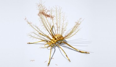 U.S.-Spanish scientists have found evidence of what they say is the oldest known camouflaging behavior in insects. This is an artist’s reconstruction of H. diogenesi (J. A. Peñas) A paper published in the Proceedings of the National Academy of Sciences reports the discovery of a fossil of a new insect larva species with specialized pack of plant remains. The 4-mm-long fossil is a predatory larva of the order Neuroptera. It is covered by a tangle...