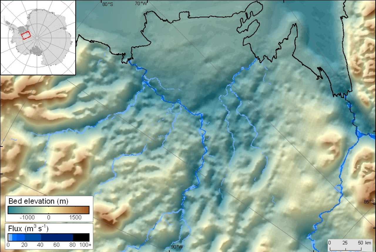 Subglacial topography and predicted flow routes for catchments of the Institute Ice Stream and the Möller Ice Stream. Image credit: Anne M. Le Brocq et al.