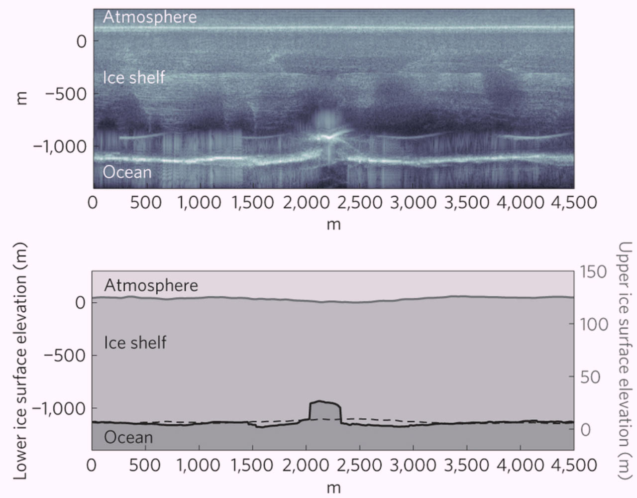 Radar echogram, top, and measured elevations of the Möller sub-ice-shelf channel. Image credit: Anne M. Le Brocq et al.