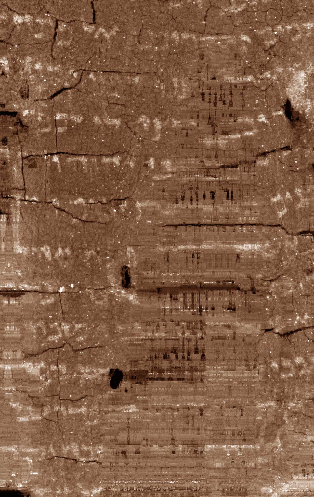 Unwrapped texture image of the Ein Gedi scroll, showing letters of the Hebrew alphabet. Image credit: Seth Parker / University of Kentucky.