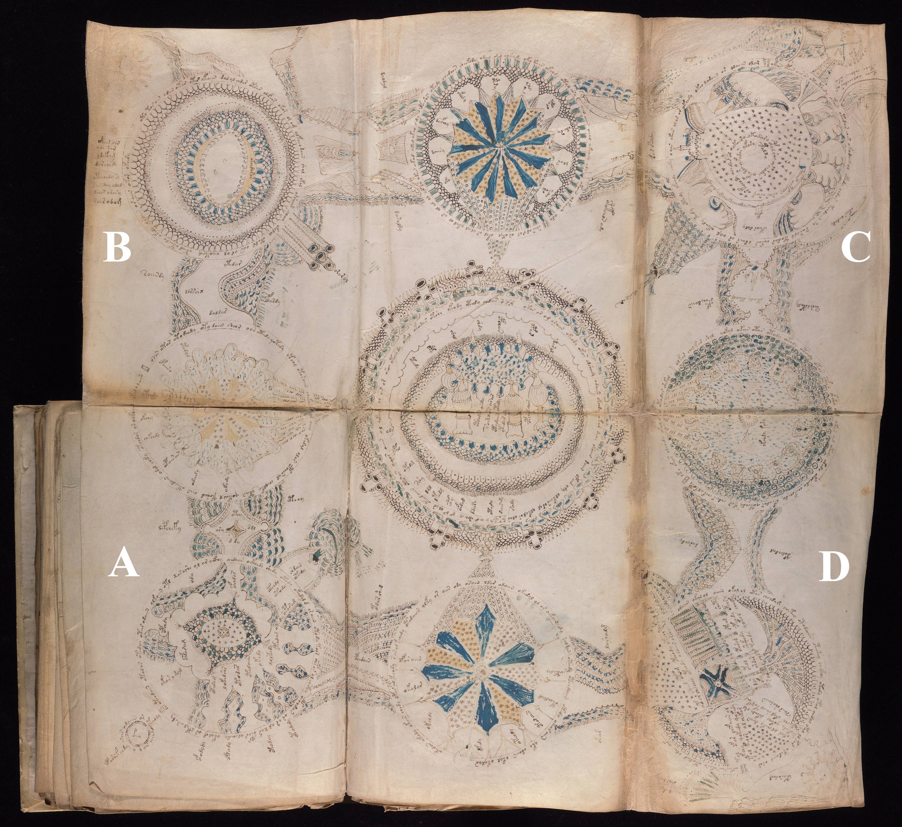 The Voynich manuscript, folio 85v and 86r, a foldout pictorial map: vignette A illustrates the erupting volcano that prompted the rescue mission and the drawing of the map; it rose from the seabed to create a new island given the name Vulcanello, which later became joined to the island of Vulcano following another eruption in 1550; vignette B depicts the volcano of Ischia, vignette C shows the islet of Castello Aragonese, and vignette D represents the island of Lipari; each vignette includes a combination of naïvely drawn and somewhat stylized images along with annotations to explain and add detail; the other five vignettes describe further details of the story. Image credit: Beinecke Library, Yale University.