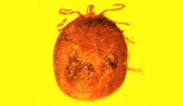 A blood-engorged nymphal tick of the genus Amblyomma surrounded by fossilized mammalian erythrocytes (red blood cells) has been discovered in a piece of 15-45-million-year-old amber. The discovery is reported March 20 in the online edition of the Journal of Medical Entomology. This blood-engorged nymphal hard tick Amblyomma sp. (length – 2.5 mm) found as a fossil in Dominican amber shows two small holes in its back, as if it were just picked...