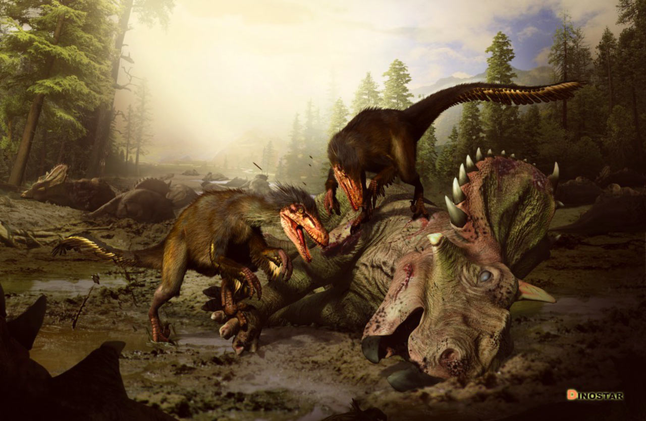 A pair of Boreonykus certekorum dinosaurs eating a Triceratops. Image credit: University of New England.