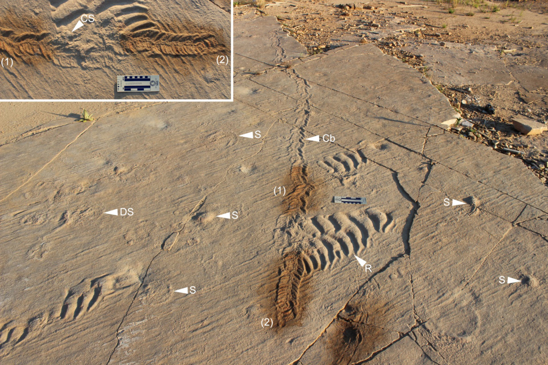 The mollusk trail Climactichnites blackberriensis (Cb) presumably stopping to eat a scyphozoan (jellyfish) that had washed up on shore. CS = clasts of a scyphozoan; DS = decomposing scyphozoan; R = ripple marks; S = scyphozoan.