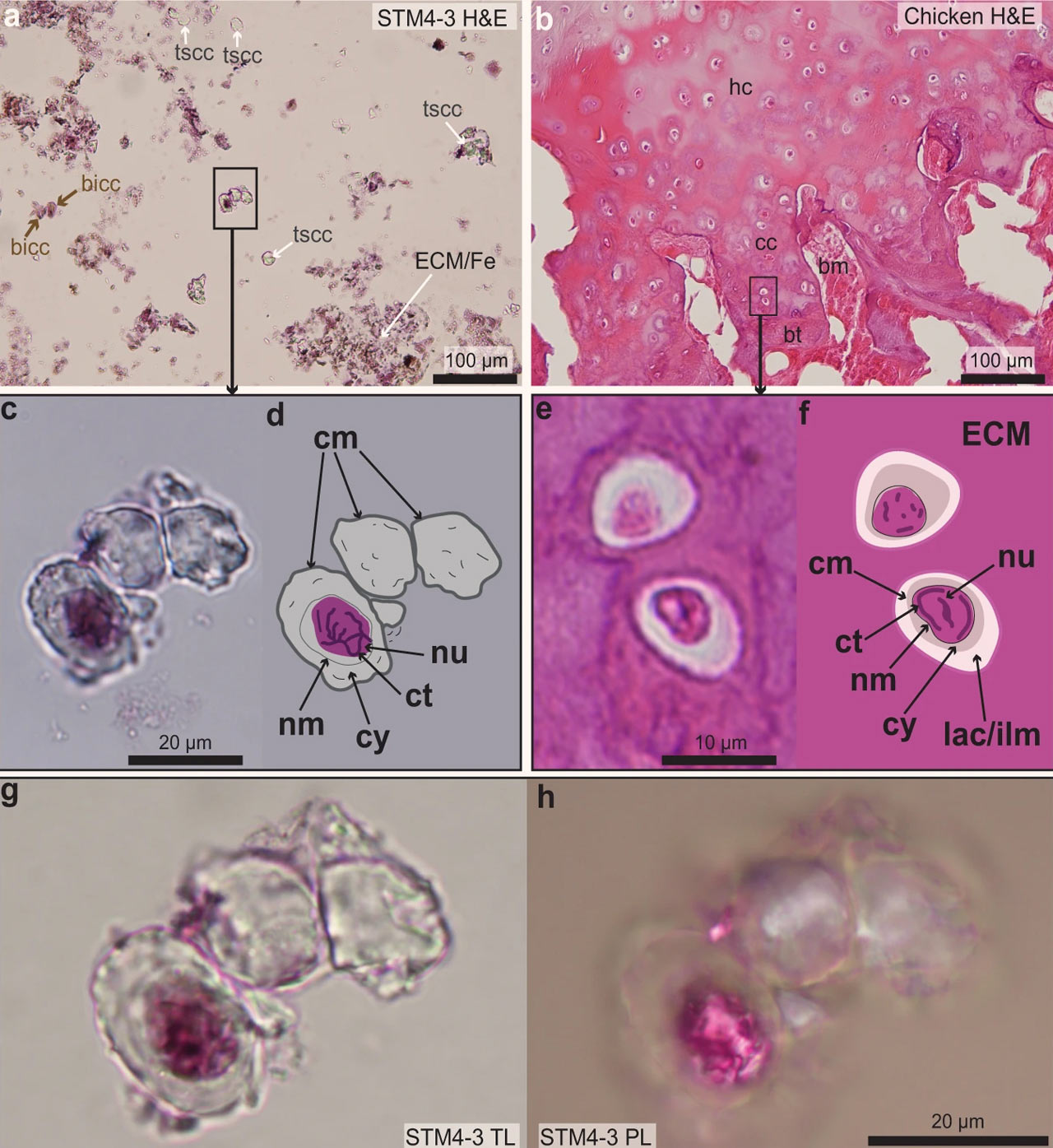 Photographs of stained paraffin sections of the cartilage of Caudipteryx (a, c, d, g, h) and that of an extant chicken (b, e, f). Image credit: Zheng et al., doi: 10.1038/s42003-021-02627-8.